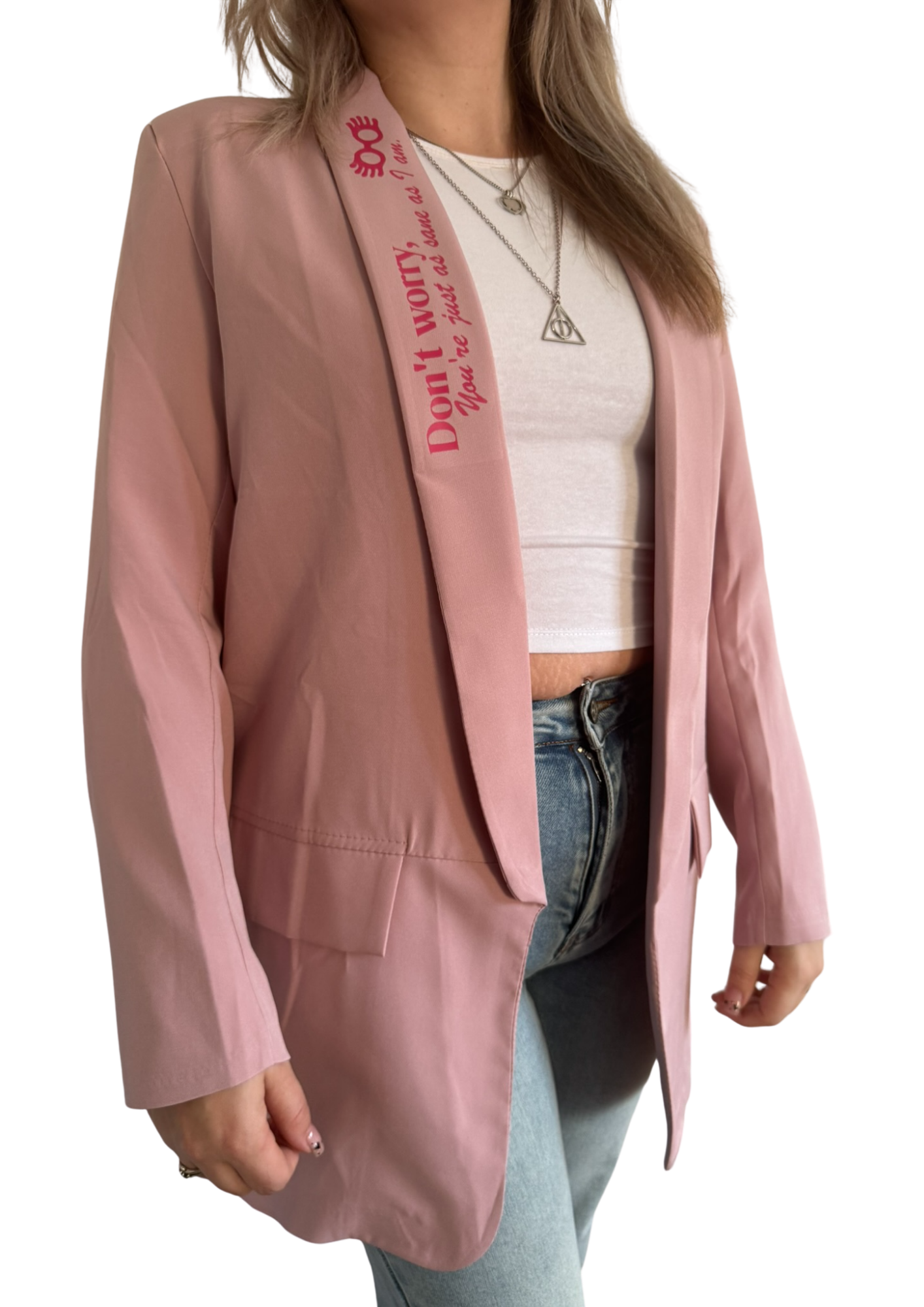 The Soft Chaos Blazer is een lichtroze, open blazer die laat zien dat anders zijn geen uitzondering is, maar een kracht.
