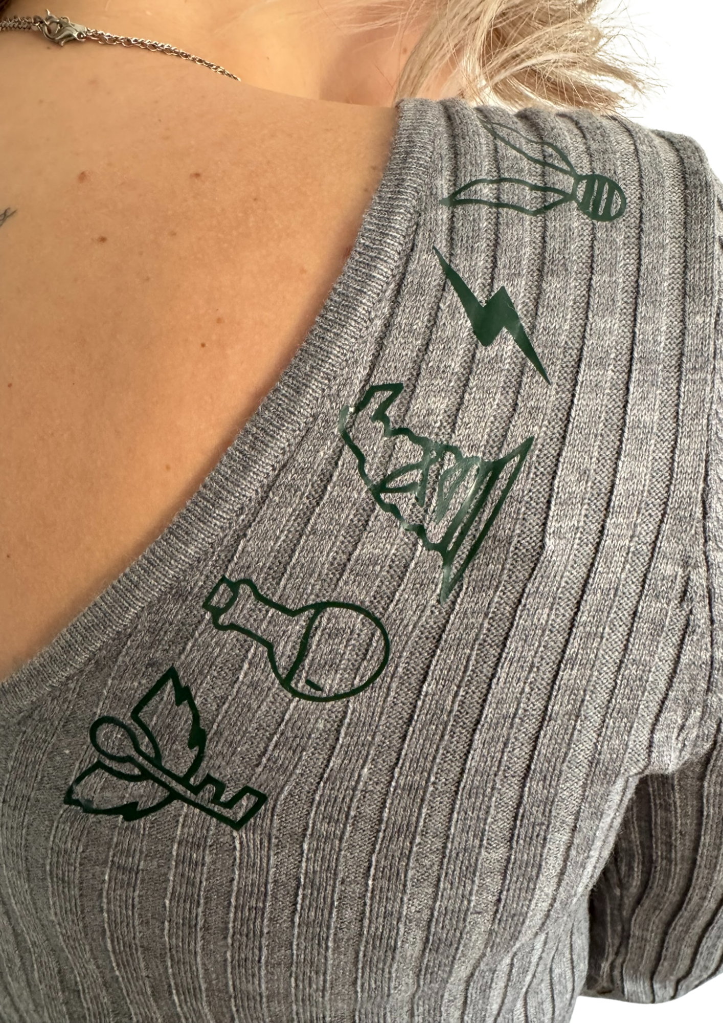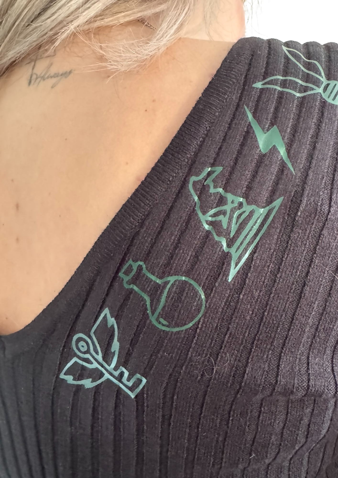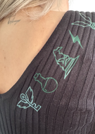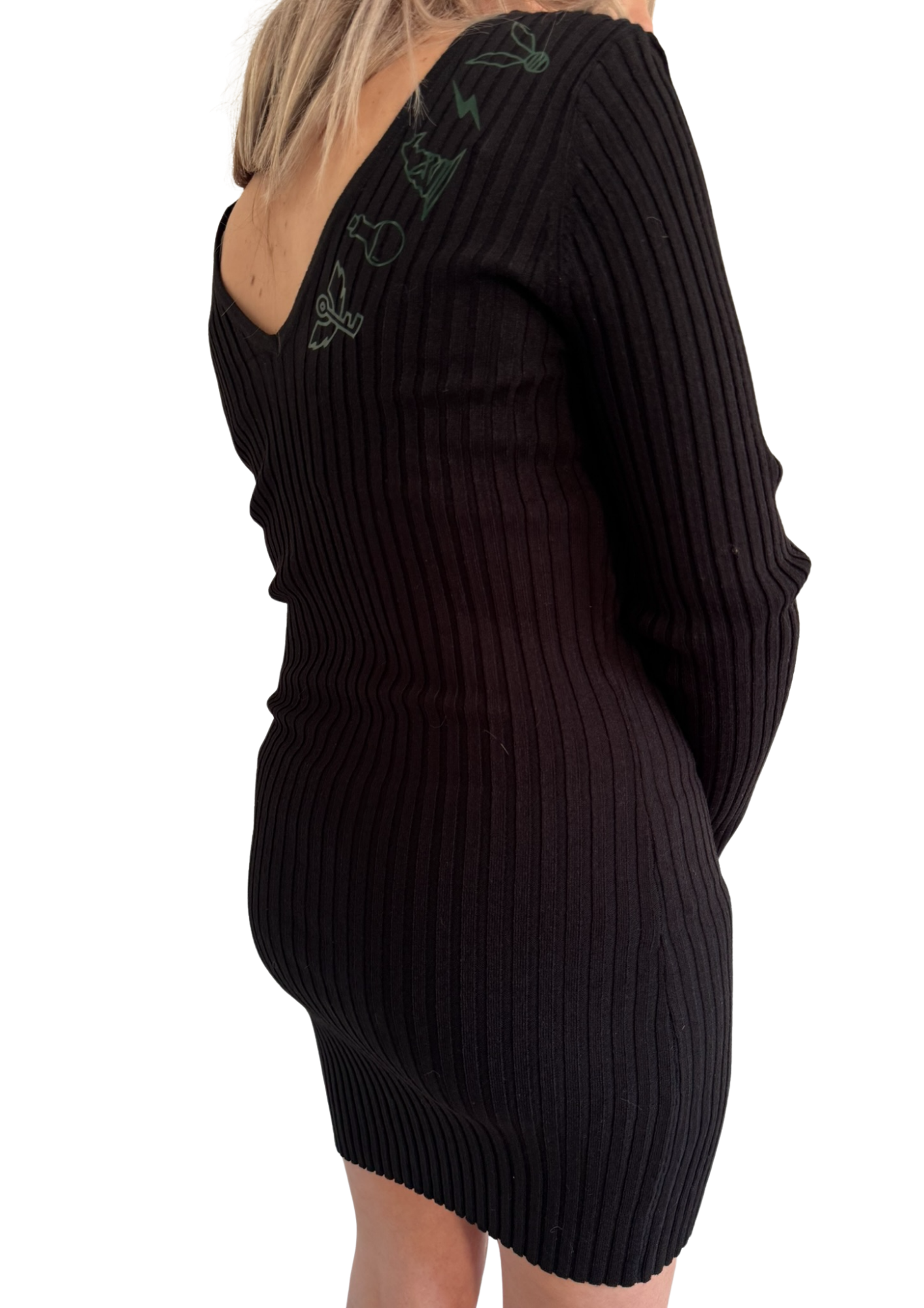 De Storyline Knit Dress is een gebreid jurkje met een elegante V-hals voor én achter. Langs de V op de rug loopt een rij subtiele symbolen — elk met een eigen betekenis, samen één verhaal.